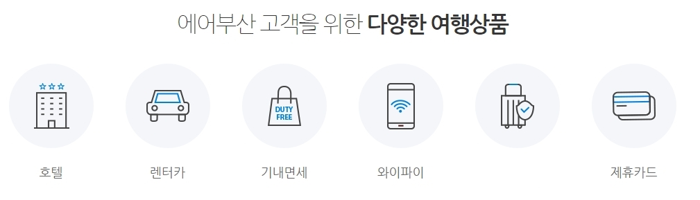 7. 에어부산 고객을 위한 다양한 여행 상품 섹션에서는 호텔, 렌터카, 기내 면세품, 와이파이, 제휴카드와 같은 부가 서비스를 소개합니다. 이를 통해 항공권 외에도 여행에 필요한 다양한 상품을 간편히 준비할 수 있습니다.