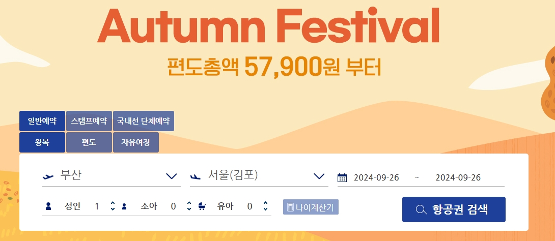 2. 홈페이지 상단에서는 Autumn Festival이라는 테마로 항공권 프로모션을 진행하며, 편도 총액 57,900원부터 시작하는 저렴한 항공권을 제공합니다. 사용자는 왕복, 편도, 자유여정 옵션을 선택하여 출발지와 도착지, 여행 날짜를 입력해 항공권을 검색할 수 있습니다.