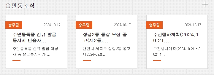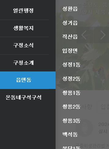 6. 읍면동 메뉴에서는 서북구 내에 위치한 성환읍, 입장면 등 개별 지역별로 운영되는 사무소 정보와 연락처, 공지사항 등을 확인하실 수 있어요. 각 동마다 특색 있는 활동과 소식이 올라오기 때문에 거주 지역에 맞춰 자주 확인하시면 좋아요.