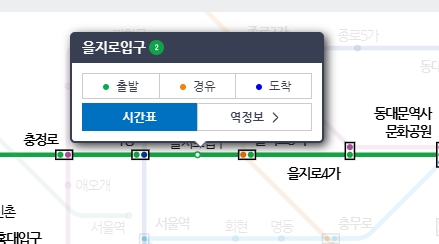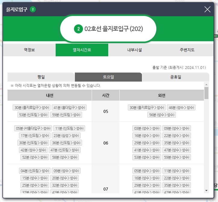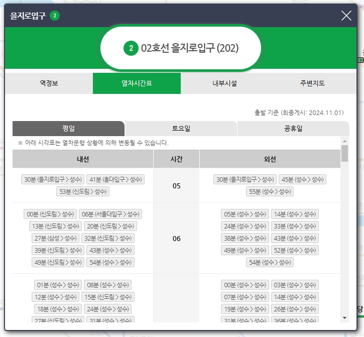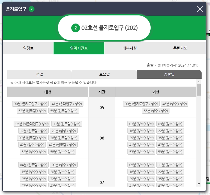 6. 예시로 을지로입구역을 검색해 보면, 내선과 외선 방향의 열차 시간표가 각각 나뉘어 있어요. 평일, 주말, 공휴일마다 조금씩 시간차가 있으니까 출발 전에 확인하고 움직이면 훨씬 수월해요.