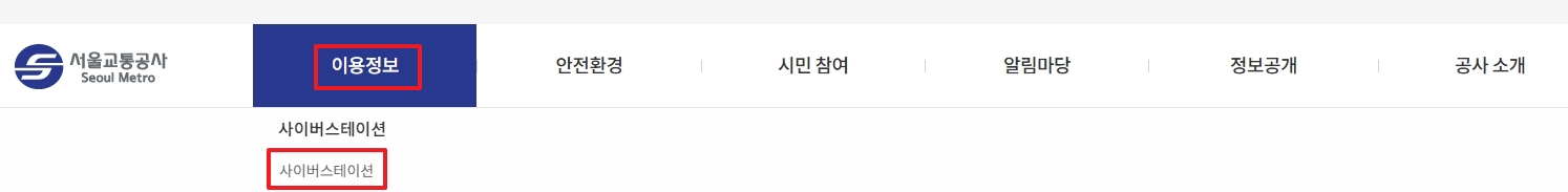 2. 홈페이지 상단의 ‘이용정보’ 메뉴를 클릭하신 후, ‘사이버스테이션’을 선택하시면 돼요. 이곳에서는 원하는 역을 검색하거나 노선을 클릭해 들어가면 바로 역 정보와 시간표를 확인할 수 있어서 사용이 굉장히 편리하더라고요.