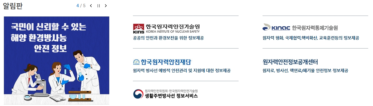 8. 마지막으로 알림판을 확인해보세요. 여기에서는 최신 공지뿐만 아니라, 다양한 협력 기관 정보도 함께 볼 수 있습니다. 특히 해양 방사능 관련 정보도 제공하고 있어서 안전에 관심 있는 분들에게 꼭 필요한 공간이에요.