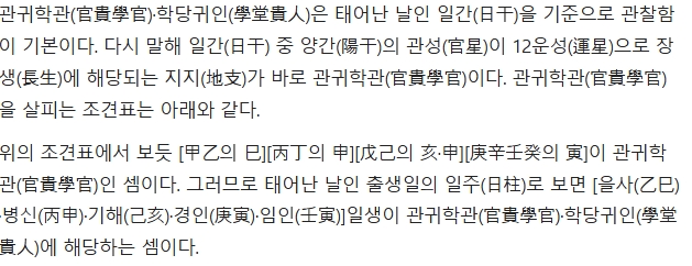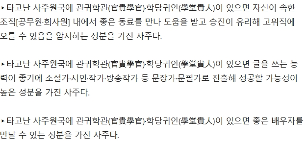5. 추가로 관귀학관이 있는 사람의 특징도 설명하고 있어요. 시험에 합격하거나 사회적으로 크게 인정받을 가능성이 높다고 해요. 그래서 공무원 시험 준비하거나 연구직에 관심 있는 분들이 자신의 사주에 관귀학관이 있는지 궁금해하는 경우도 많다고 합니다. 저도 읽으면서 괜히 사주 한 번 보고 싶어졌어요.
