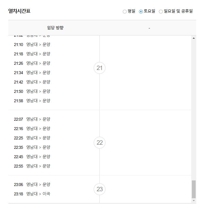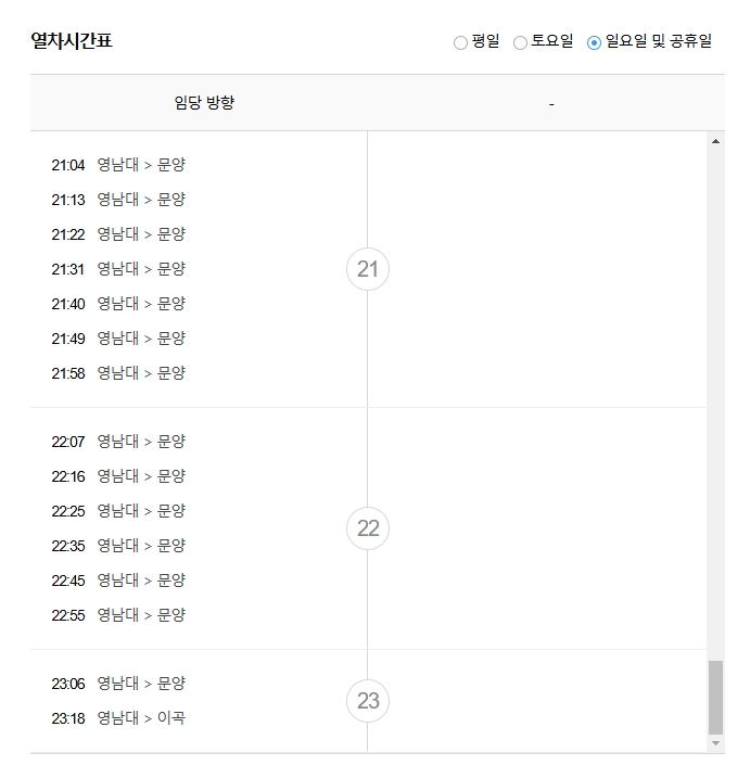7. 일요일이나 공휴일 운행 시간도 따로 확인할 수 있어요! 휴일에는 평소랑 다르게 막차 시간이 앞당겨지거나 연장될 수 있으니까요. 영남대역 기준 공휴일 막차는 평소와 비슷하게 23:18쯤 출발하는 걸로 나오네요.