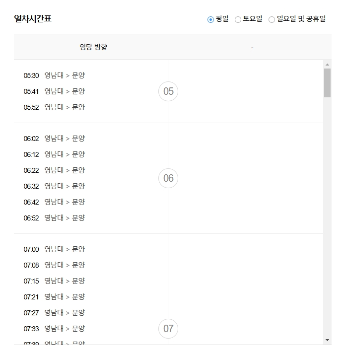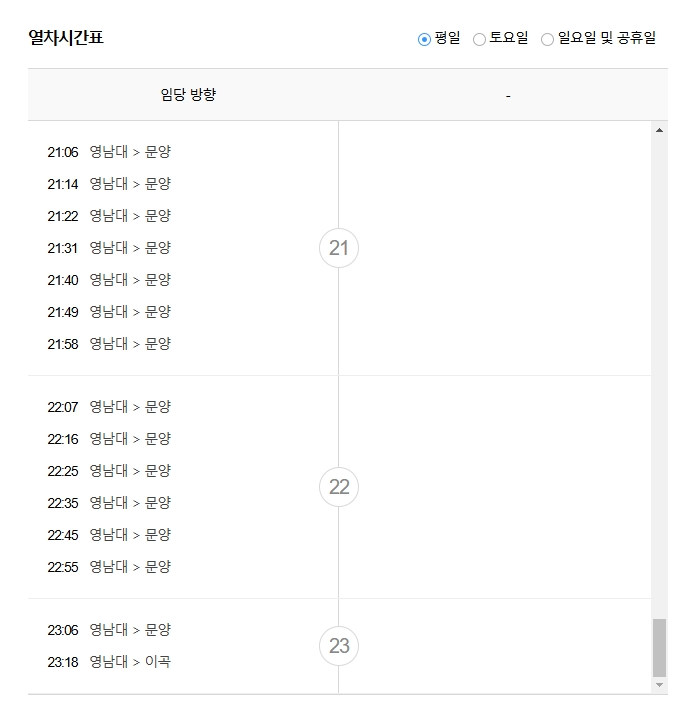 5. 평일 시간표를 선택하면 그날 기준으로 첫차, 막차 시간뿐만 아니라 배차 간격까지 다 볼 수 있어요. 예를 들면 영남대역 기준으로 문양 방향 막차는 밤 11시 18분쯤에 출발하니까, 시간 잘 맞춰서 타야겠죠?