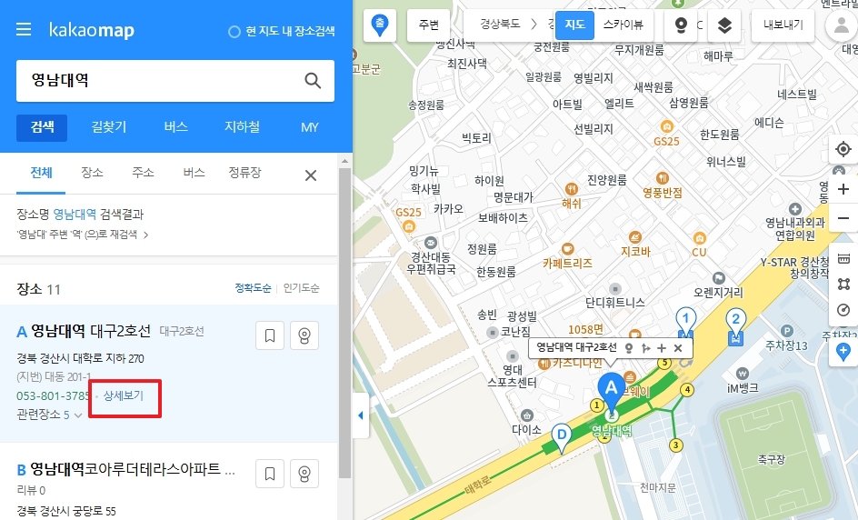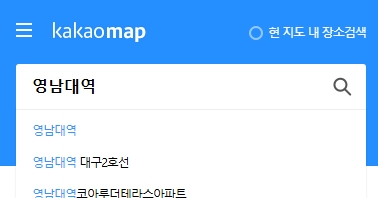 2. 상단 검색창에 찾고 싶은 역 이름을 입력하세요. 예를 들어 영남대역이라고 치면, 바로 지하철 역 정보가 뜨는데요. 이때 나오는 다양한 검색 결과 중에서 원하는 노선을 정확히 선택하는 게 포인트예요!