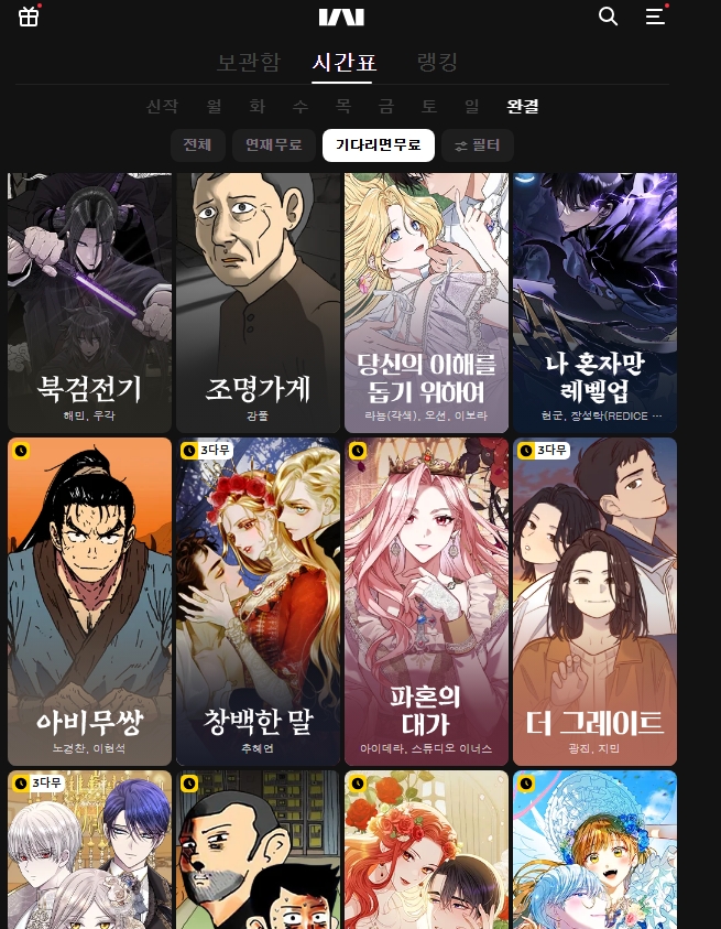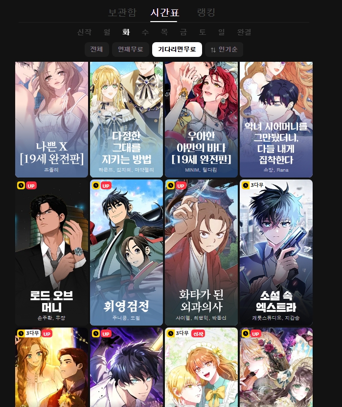 2. 상단 메뉴 중 요일별 탭을 클릭해보세요. 요일별로 정리된 웹툰들을 쉽게 확인할 수 있어서, 오늘 뭐 볼지 고민될 때 정말 유용하답니다. 월요일부터 일요일까지 꾸준히 업데이트되는 작품들이 줄줄이 대기 중이라 지루할 틈이 없어요.