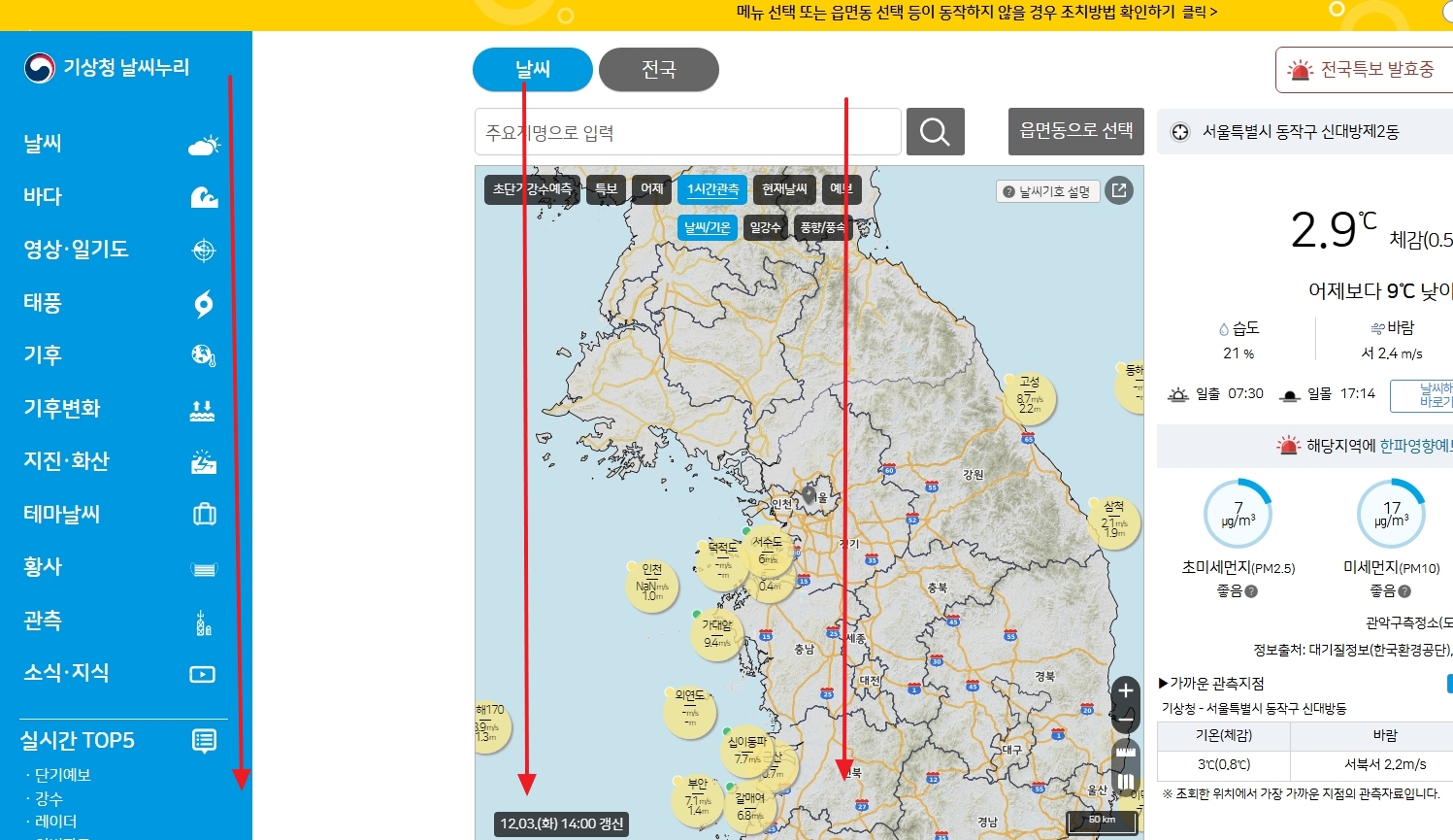 1. 먼저 대한민국 기상청 공식 홈페이지에 접속합니다. 이곳은 매일 변하는 하늘과 바다 상황, 기상 경보, 강수량 데이터, 전국 기온, 주간예보 등 다양한 기상 정보를 신속하고 정확하게 제공합니다. 개인 생활은 물론이고 산업 전반에도 꼭 필요한 정보들이 정리되어 있어 활용도가 아주 높습니다.
