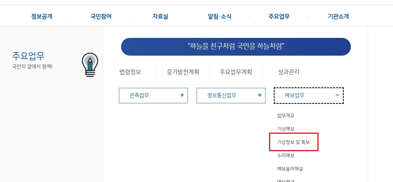 3. 연결된 페이지 상단을 보면 주요업무 항목이 있는데요, 여기를 클릭한 다음 예보업무를 선택합니다. 그 후 기상정보 및 특보 탭을 눌러주세요. 이곳에서는 대설특보 외에도 태풍, 호우, 강풍 같은 다양한 기상특보 발령 기준과 발령 절차, 주의사항들을 자세히 알 수 있습니다.