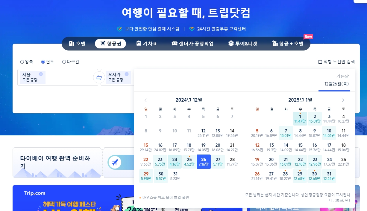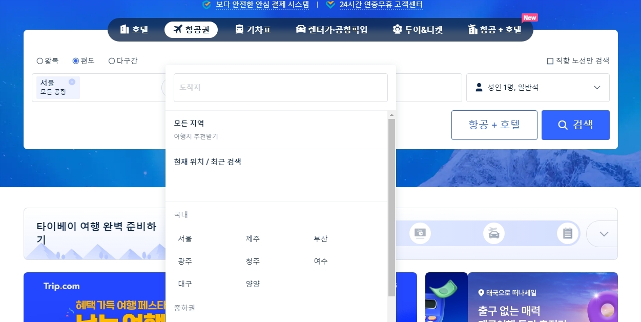 1. 트립닷컴 공식 홈페이지에 접속하시면, 항공권은 물론 호텔, 기차표, 렌터카, 공항 픽업 서비스까지 모두 한 번에 이용할 수 있습니다. 다양한 여행 서비스가 통합되어 있어 사이트 하나로 여행 준비가 끝나요. 무엇보다 24시간 상담 가능한 고객센터와 안전한 결제 시스템 덕분에 처음 이용하시는 분들도 안심하고 사용할 수 있어요.