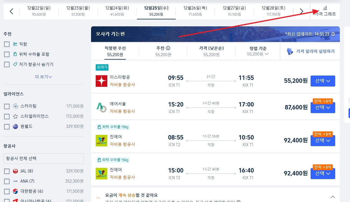 7. 가격 그래프 기능을 활용하면 며칠 차이로 항공권 가격이 얼마나 변하는지 한눈에 알 수 있어요. 예를 들면, 서울-오사카 구간을 볼 때 12월 25일이 제일 저렴하면 그 날짜로 여행을 맞출 수 있는 거죠. 최적의 날짜를 잡아서 훨씬 합리적인 예약이 가능합니다.