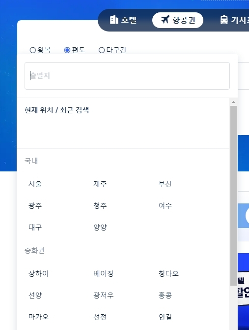 3. 항공권 검색 화면에서는 왕복, 편도, 다구간 중 원하는 여행 타입을 고를 수 있어요. 출발지와 도착지를 입력하면 자동 추천 리스트가 떠서 빠르게 입력할 수 있고, 국내외 주요 공항이 리스트로 나와 선택하기 쉬워요. 여행 계획이 복잡할 때도 걱정 없겠죠?