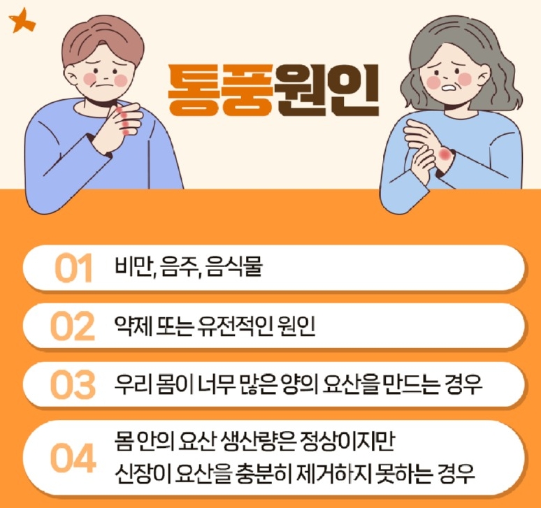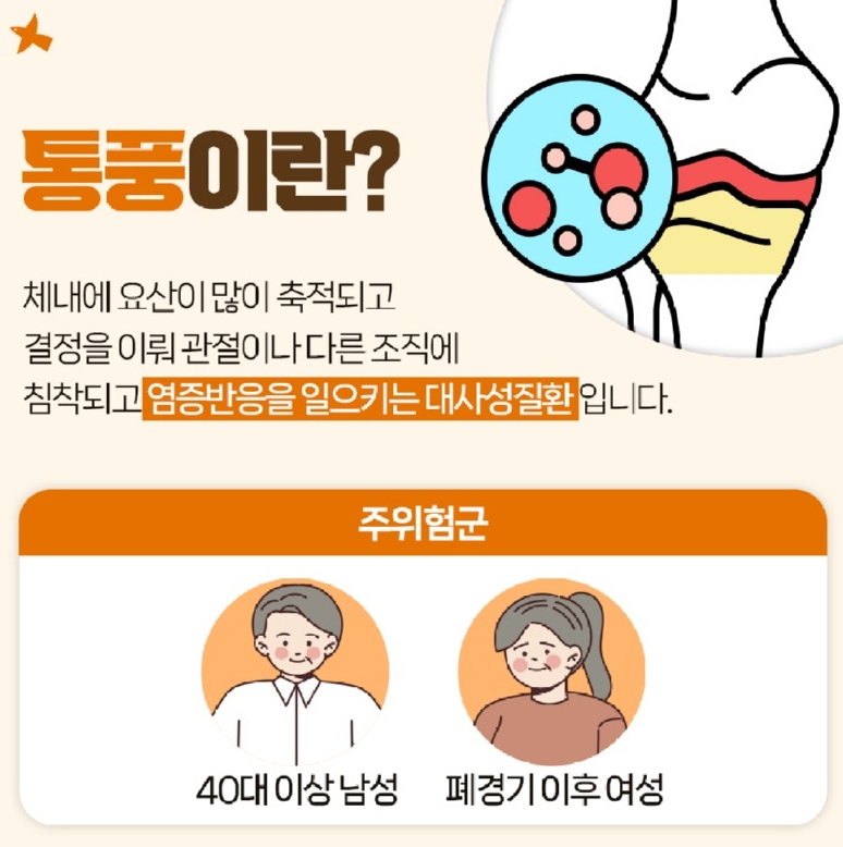 4. 통풍은 요산이라는 물질이 관절에 쌓이면서 염증을 유발하는 질환입니다. 남성에게 흔하지만 여성도 폐경 이후엔 나타날 수 있고, 보통 첫 증상은 발가락 관절에서 시작됩니다.