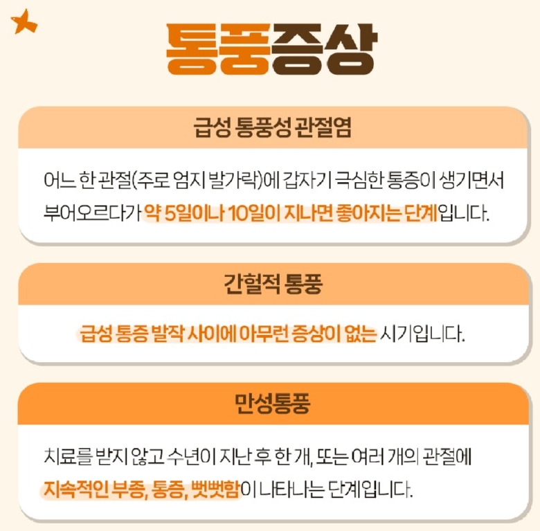 7. 통풍은 증상이 계속 나타나는 경우 단계별로 진행됩니다. 처음에는 급성으로 시작하지만 치료를 미루면 간헐적으로 증상이 반복되고, 결국 만성화되어 여러 관절이 손상될 수 있습니다.
