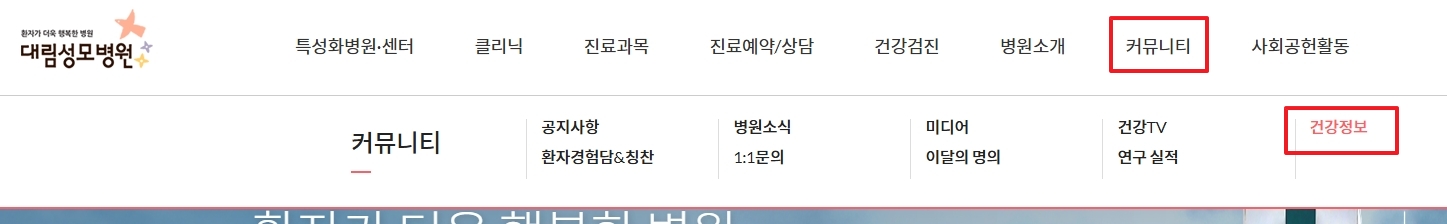 2. 상단 메뉴의 커뮤니티 항목을 클릭하면 건강 관련 콘텐츠가 있는 페이지로 이동합니다. 이곳에서는 통풍을 포함한 여러 질환에 대한 정보와 생활 속 예방법까지 다양하게 소개되고 있어 참고하기 좋습니다.