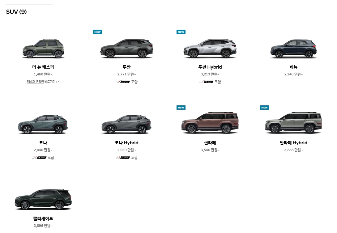 6. SUV가 필요하다면 ‘SUV’ 카테고리를 클릭해보세요. 캐스퍼부터 펠리세이드까지, 크기나 기능에 따라 선택할 수 있고, 하이브리드 모델도 함께 소개되어 있어 연비를 고려한 차량 선택에 유리합니다.