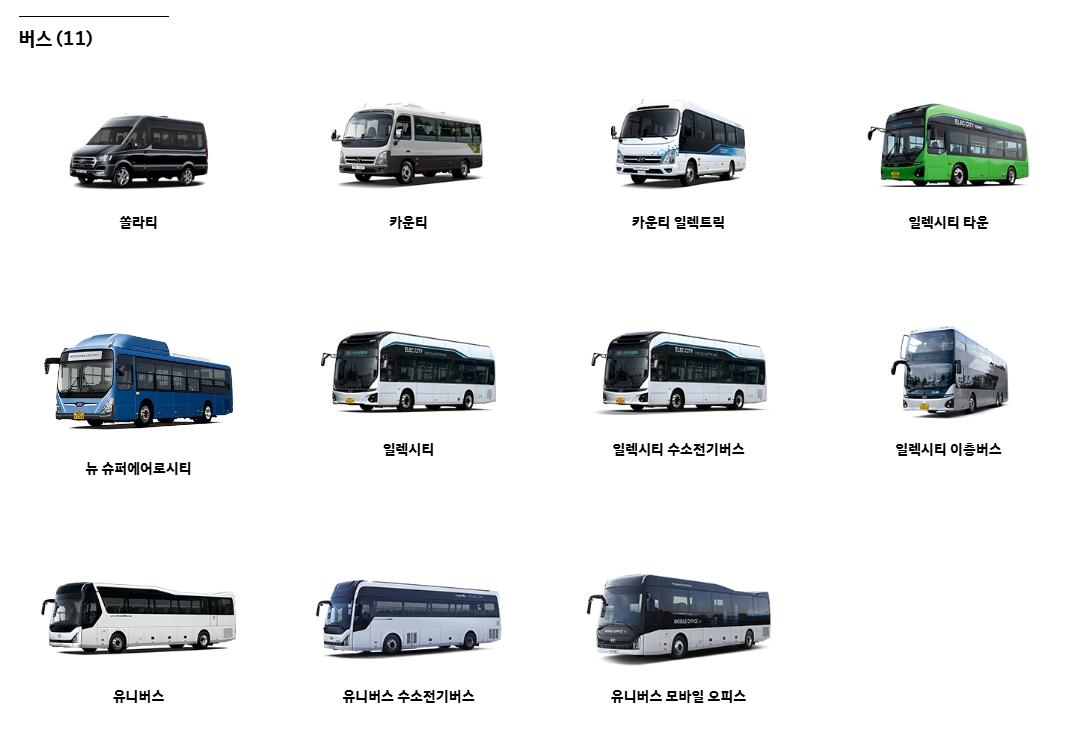 10. ‘버스’ 카테고리에서는 다양한 대중교통용 차량을 확인할 수 있어요. 쏠라티, 카운티, 일렉시티 같은 모델이 포함돼 있고, 특히 일렉시티는 친환경 전기 버스로 교통 환경 개선에 도움을 주는 차량이에요.
