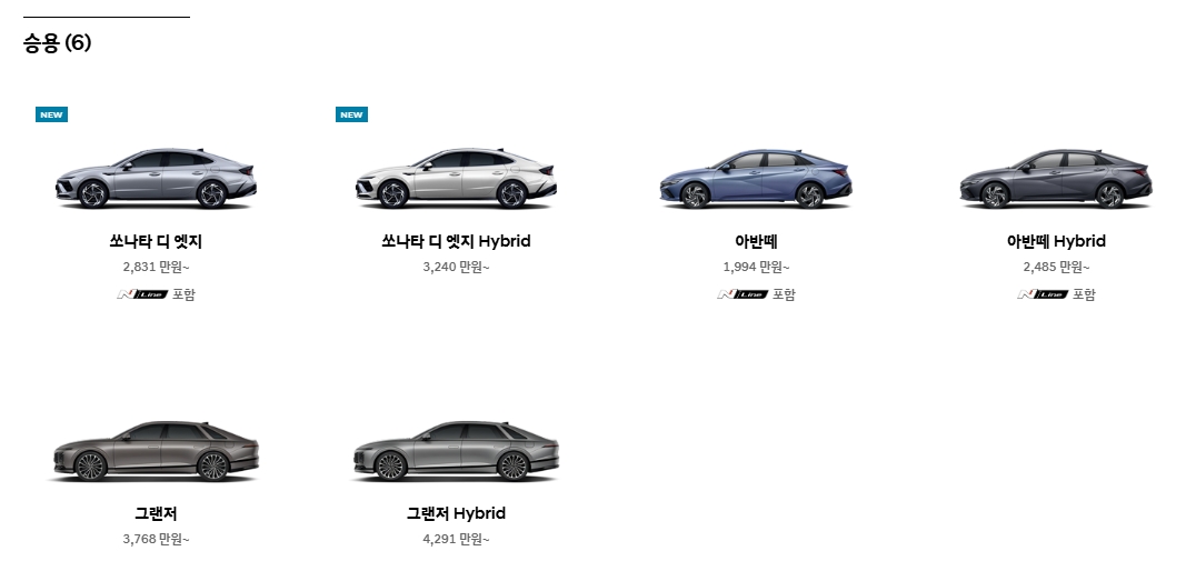 5. 세단 종류는 ‘승용차’ 카테고리에서 확인할 수 있어요. 쏘나타 디 엣지, 아반떼, 그랜저 등 다양한 크기와 기능을 가진 모델들이 있으며, 하이브리드 버전도 함께 소개돼서 연비나 환경 영향을 고려한 선택도 가능합니다.