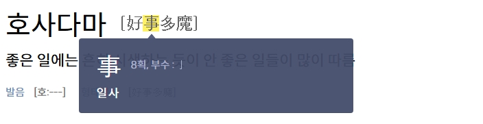 3. 각각의 한자가 가진 의미를 살펴보면, ‘좋을 호(好)’, ‘일 사(事)’, ‘많을 다(多)’, ‘마귀 마(魔)’로 되어 있어, 말 그대로 좋은 일에 마(魔)가 많다는 식으로 풀이됩니다.