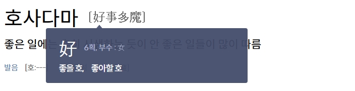 2. 검색창에 호사다마를 입력하면, 한자 표기와 함께 의미가 나옵니다. 이 표현은 좋은 상황이 생길 때 예상 못한 문제도 함께 올 수 있다는 경고의 의미로 쓰입니다.