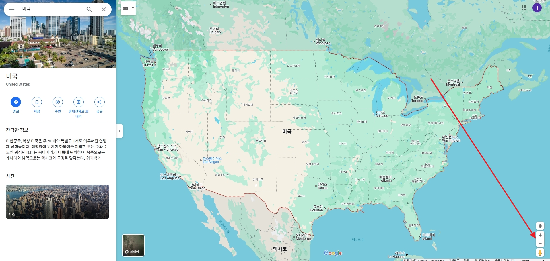 전체 화면 모드를 쓰면 브라우저 메뉴나 검색창 없이 지도만 크게 보이니까 집중하기 좋고, 키보드 방향키로 지도를 살짝씩 움직여도 자연스럽게 따라와요. 필요할 때는 축소 버튼을 눌러 북미 대륙 전체를 한눈에 담거나, 확대 버튼을 눌러 뉴욕 맨해튼 구석구석까지 세밀하게 살펴볼 수 있습니다.