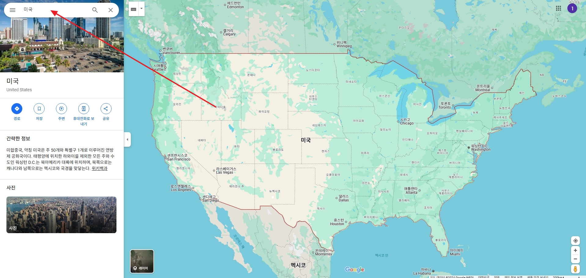 2. 검색창에 미국이라고 입력하면 미국 전역이 한 화면에 나타납니다. 지도에는 주요 도시명과 도로가 한글로 표시되어 있어서 위치 파악이 편리하고, 원하는 지역으로 바로 이동할 수 있어요.