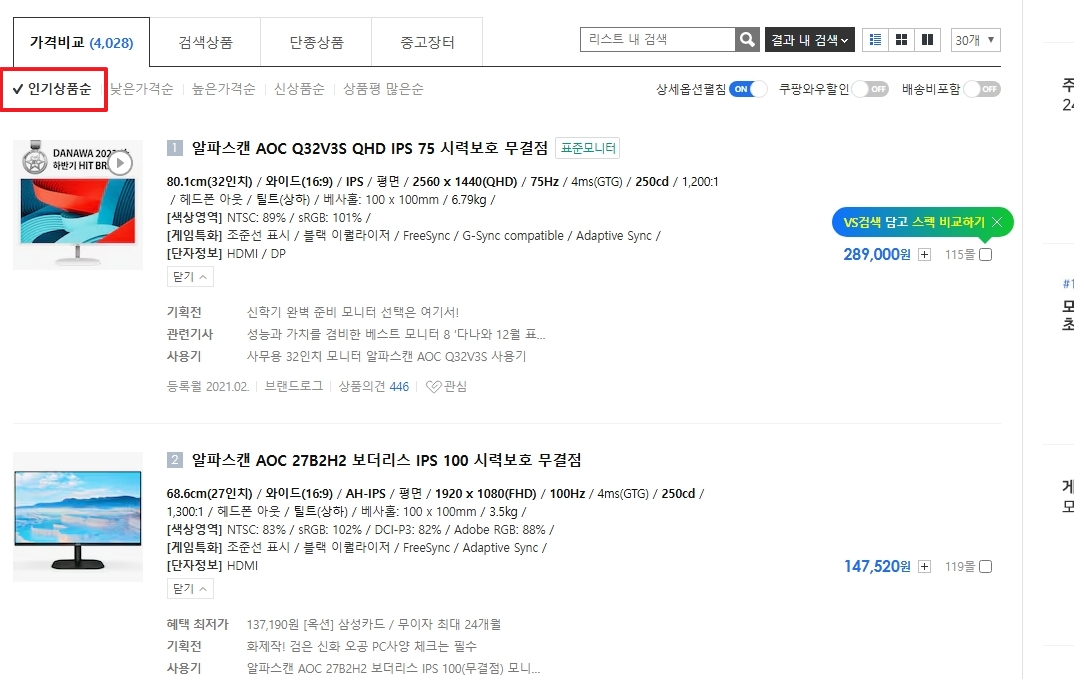 조건에 맞는 제품이 너무 많다면 ‘인기상품순’ 정렬을 활용하세요. 많은 사람들이 선택한 순서대로 제품이 나와서 검증된 제품 중심으로 비교할 수 있어요. 리뷰 수가 많은 제품일수록 리스크도 적어요!