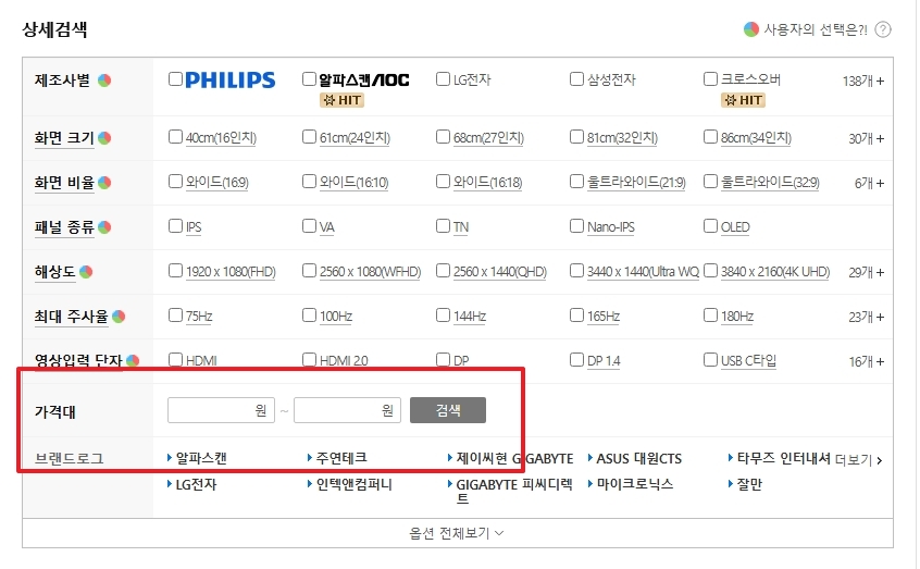 다나와의 진짜 핵심 기능은 바로 상세검색입니다! 해상도, 주사율, 패널 종류, 크기, 가격까지 모두 입력하면 딱 내 조건에 맞는 제품만 보여줘요. 복잡한 비교 없이도 정리된 리스트를 볼 수 있어서 정말 편해요.