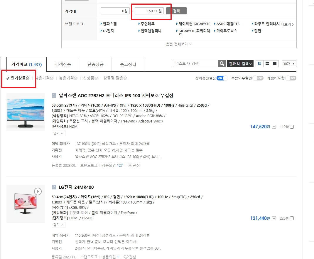 검색창에 ‘모니터’만 입력하면 너무 많은 제품이 나와요. ‘27인치 QHD 144Hz IPS’처럼 조건을 명확히 적으면 원하는 제품만 필터링돼서 찾기 쉬워요. 불필요한 시간 낭비 없이 내게 딱 맞는 모니터만 확인 가능!