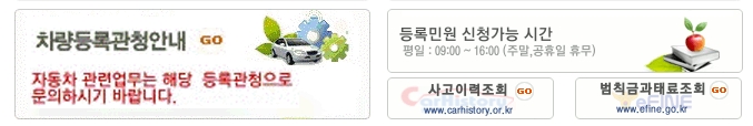페이지 하단에는 차량등록관청안내와 사고이력조회, 범칙금과태료조회와 같은 추가 서비스 링크가 배치되어 있습니다. 이 링크를 통해 사고 이력 조회 사이트나 과태료 관련 정보를 확인할 수 있으며, 차량 관련 업무를 처리하기 위한 다양한 자료를 한눈에 확인할 수 있어 사용자 편의를 극대화합니다.