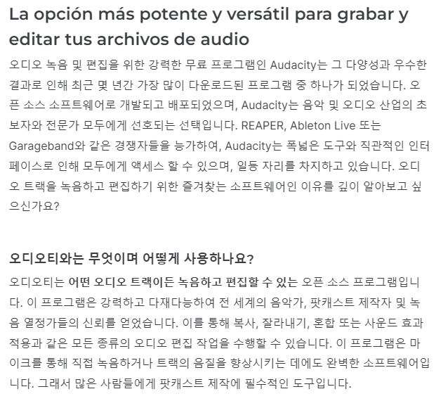 음악 제작자와 팟캐스트 제작자에게 최적화된 도구로, 오디오 트랙을 녹음하고 자르고 붙이는 등의 편집 기능을 폭넓게 지원합니다. 또한 노이즈 제거, 리버브, 에코 등 고급 이펙트와 필터 기능도 함께 제공되어 전문적인 품질의 오디오 작업이 가능합니다.