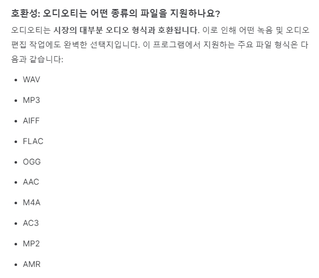 WAV, MP3, AIFF, FLAC, OGG, AAC, M4A, AC3 등 주요 오디오 파일 대부분을 지원합니다. 파일 형식 간 변환도 간편하며, 다른 편집 프로그램과의 연동이 쉬워 다양한 상황에서 유연하게 활용할 수 있습니다.