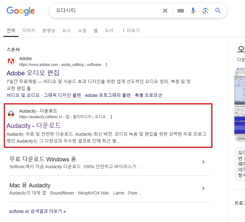 소프토닉 사이트에 접속하면 Windows용 오다시티를 무료로 다운로드할 수 있습니다. 한국어를 포함한 다국어 인터페이스를 제공하고, 현재 가장 최신 버전은 3.7.1로 안정성과 성능 면에서 우수합니다. ‘다운로드’ 버튼을 클릭하면 설치 파일이 자동으로 다운로드됩니다.