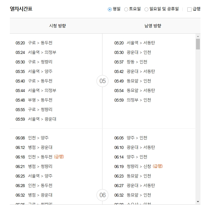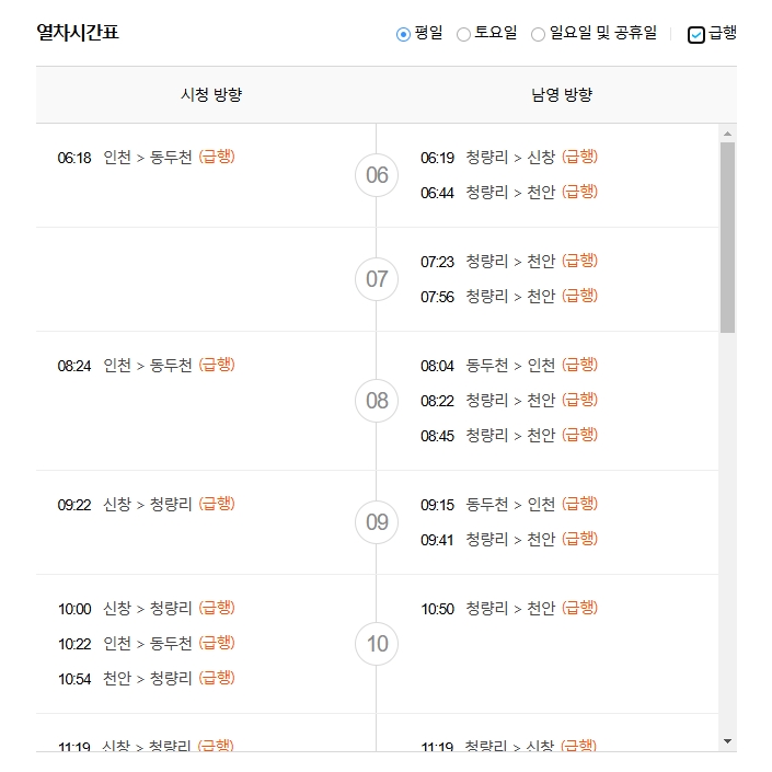 급행 열차는 일반보다 빠르지만 정차역이 적어요. 예를 들어, 인천에서 동두천 가는 급행은 06:18, 08:24 출발입니다. 반대 방향인 청량리→신창은 06:19에 출발하니, 급행을 이용할 땐 시간과 정차역을 꼭 확인해야 합니다.