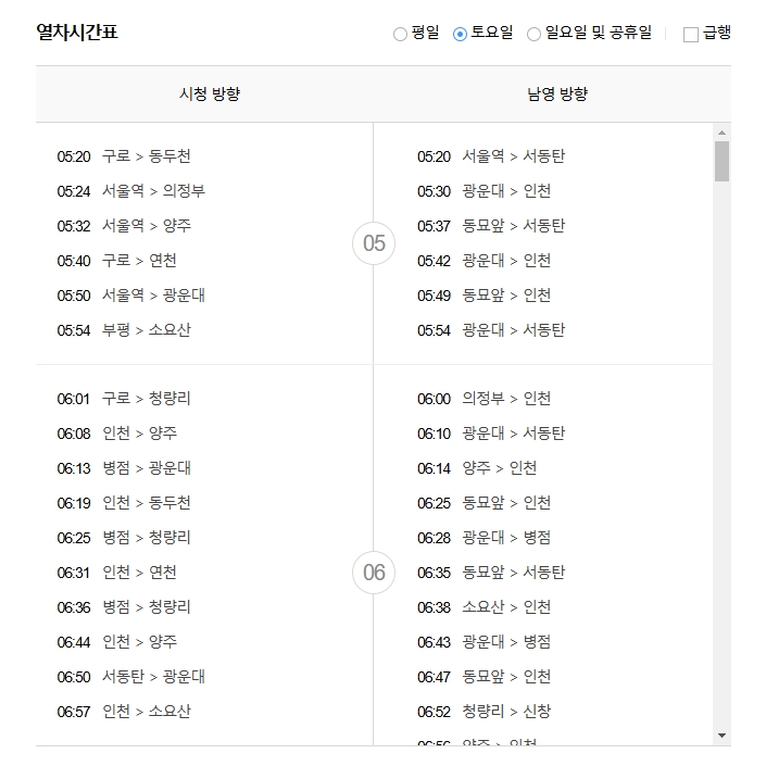 시간표는 평일, 토요일, 공휴일로 나뉘어 있어서, 내가 이용할 날짜에 맞는 걸 꼭 선택해야 합니다. 요일을 잘못 선택하면 전철을 놓칠 수 있으니 주의하세요.