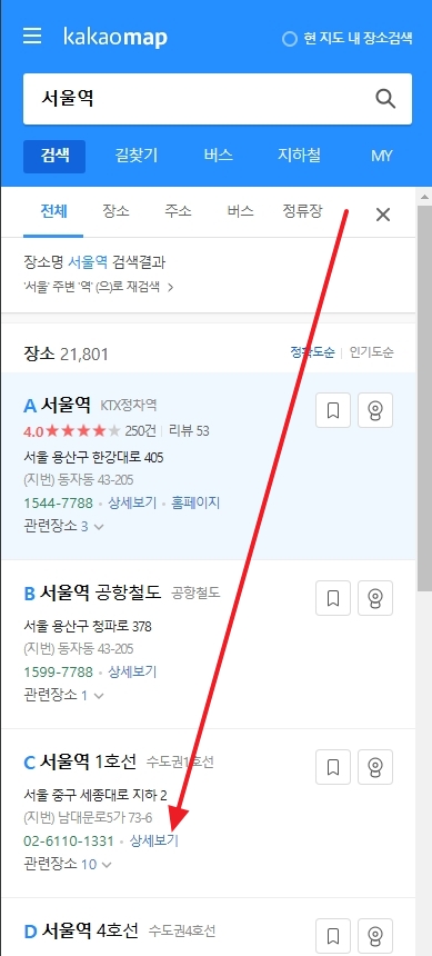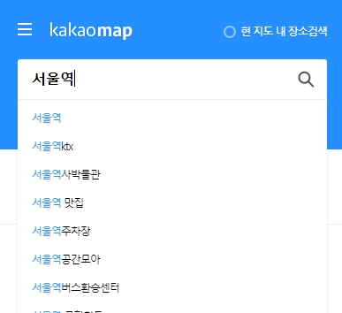 검색창에 서울역처럼 이용할 전철역을 입력하면 됩니다. 주요 역은 동일한 이름으로 다양한 시설이 뜨기 때문에, 지하철 1호선, 2호선 등 정확한 노선을 확인해서 클릭하는 것이 중요합니다.