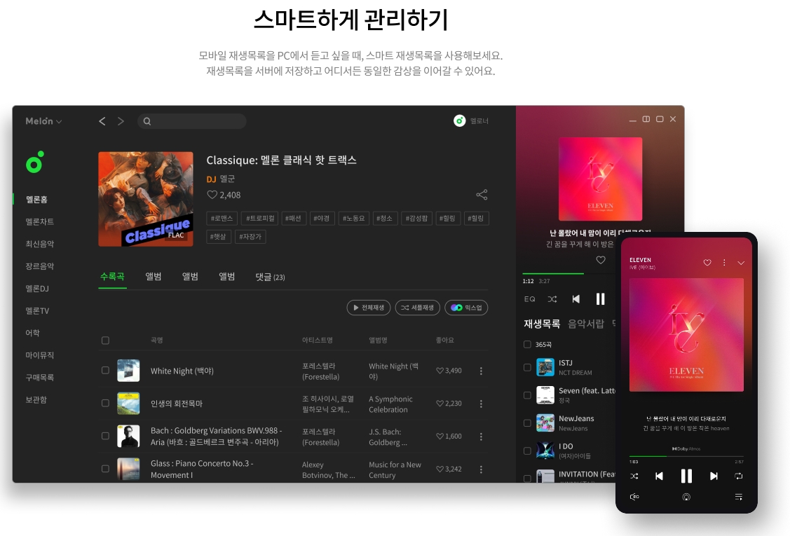 PC와 모바일 간 연동을 통해 언제 어디서나 동일한 재생목록과 환경으로 음악을 즐길 수 있습니다.