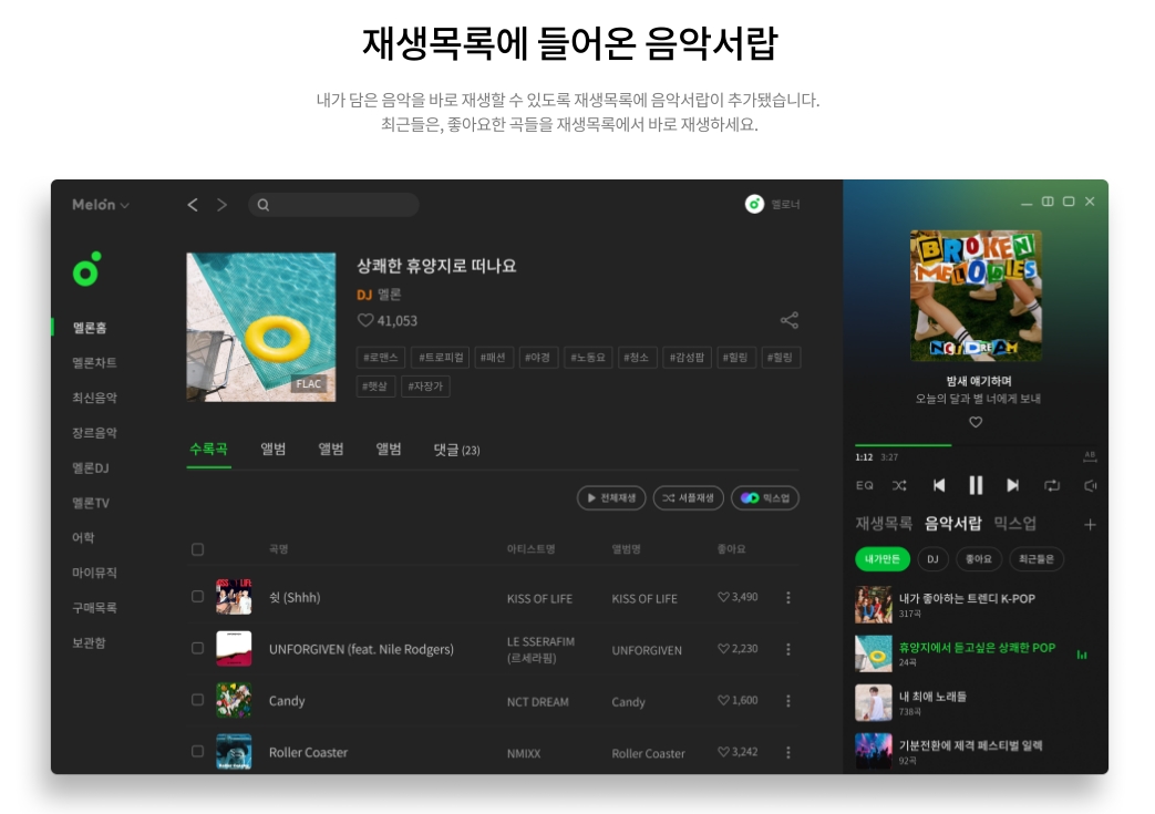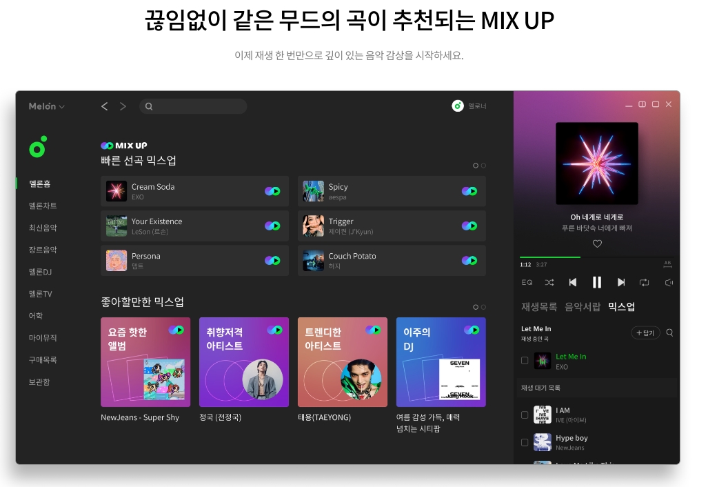 개인화 추천, 최신 차트, 저장된 리스트, DJ 콘텐츠까지 다양한 기능을 통해 더 풍성한 음악 환경을 누릴 수 있습니다.