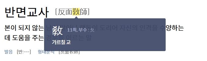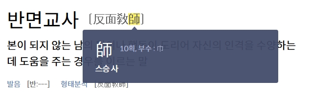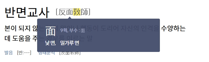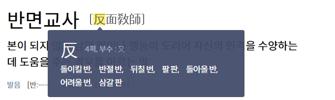 반면교사는 '反面敎師'라는 한자어로, 반(反)은 반대, 면(面)은 얼굴, 교(敎)는 가르치다, 사(師)는 스승을 의미합니다. 즉, '반대로 가르침을 주는 사람'이라는 뜻이 됩니다.