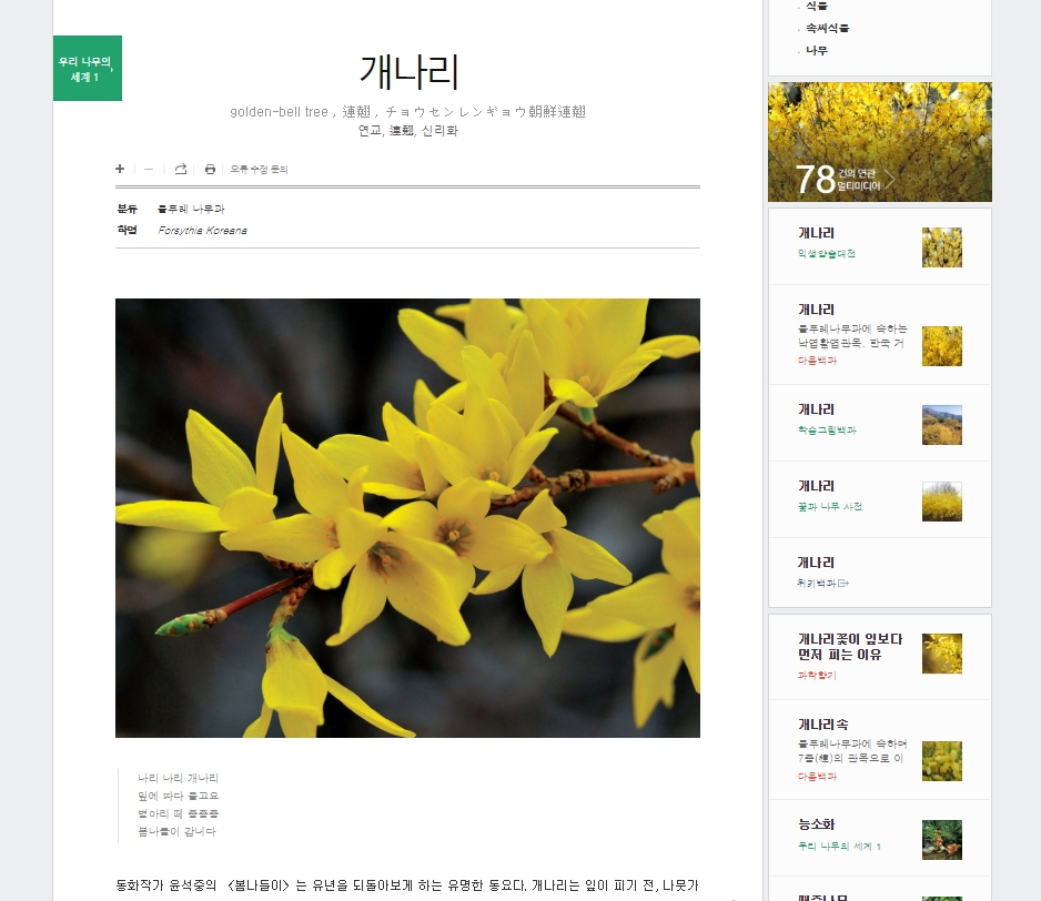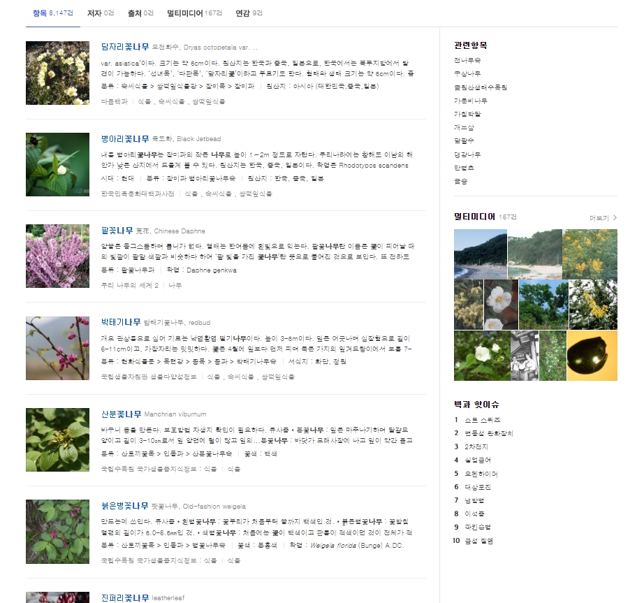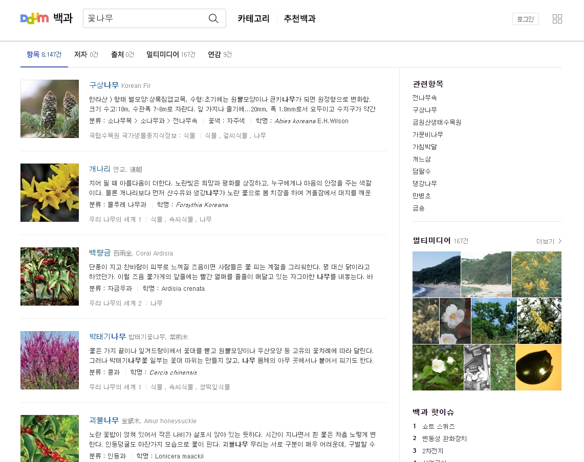다음백과는 다양한 꽃나무 정보를 제공하는 아주 유용한 사이트입니다. 검색 정확도와 관련 사진, 학명 등의 정보가 잘 정리되어 있어 꽃나무 이름을 찾기에 안성맞춤입니다.