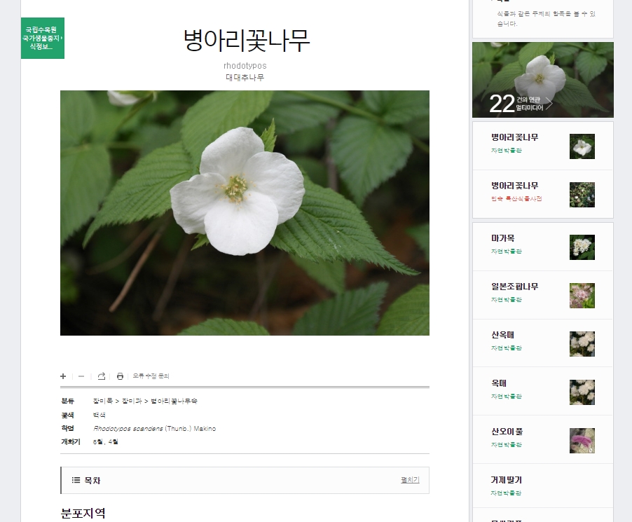 해당 꽃나무의 학명, 분류군, 생육환경 등 상세한 정보를 확인할 수 있으며, 비슷한 꽃들까지 함께 추천되어 이름을 비교하며 찾는 데 매우 유용합니다.