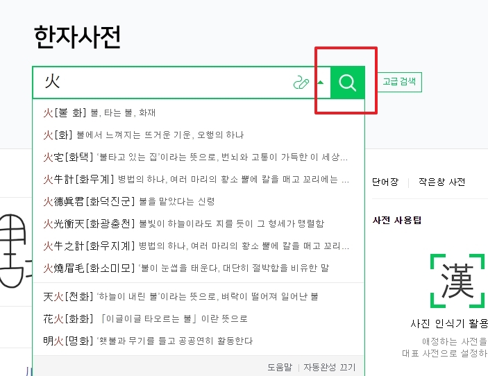찾은 한자를 클릭하면 검색창에 자동 입력되며, 돋보기 버튼을 눌러 검색을 진행할 수 있습니다. 이 과정을 통해 정확한 의미와 활용 정보를 확인할 수 있습니다.