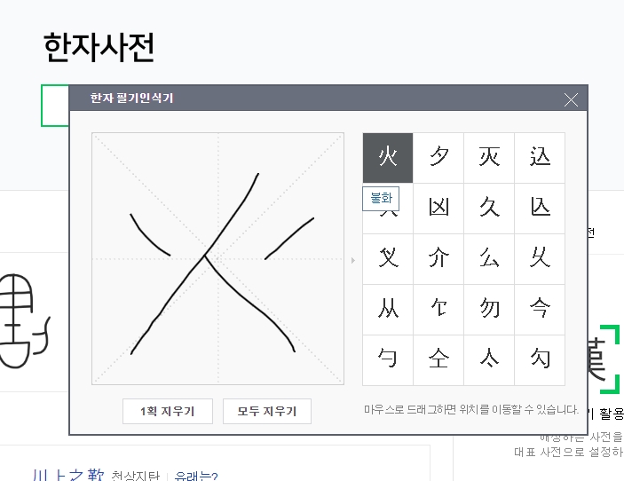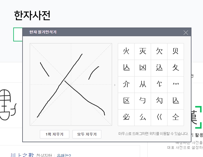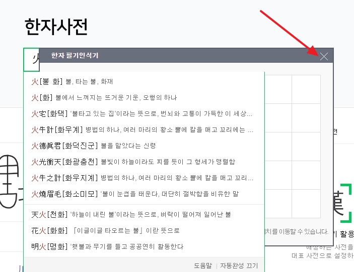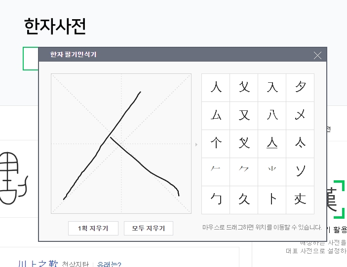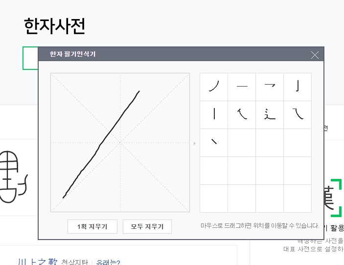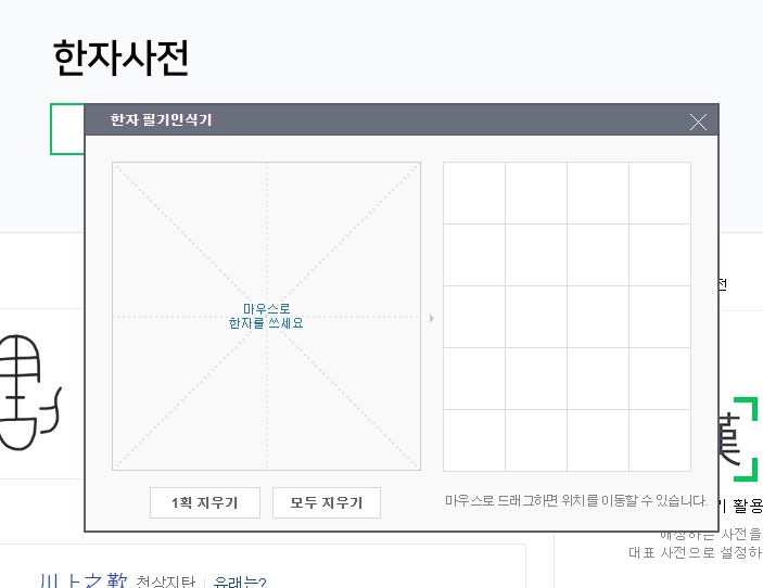 검색창 옆의 연필 모양 아이콘을 클릭하면 필기 인식 창이 나타납니다. 여기서 마우스나 손가락으로 한자를 직접 그려 입력할 수 있습니다.