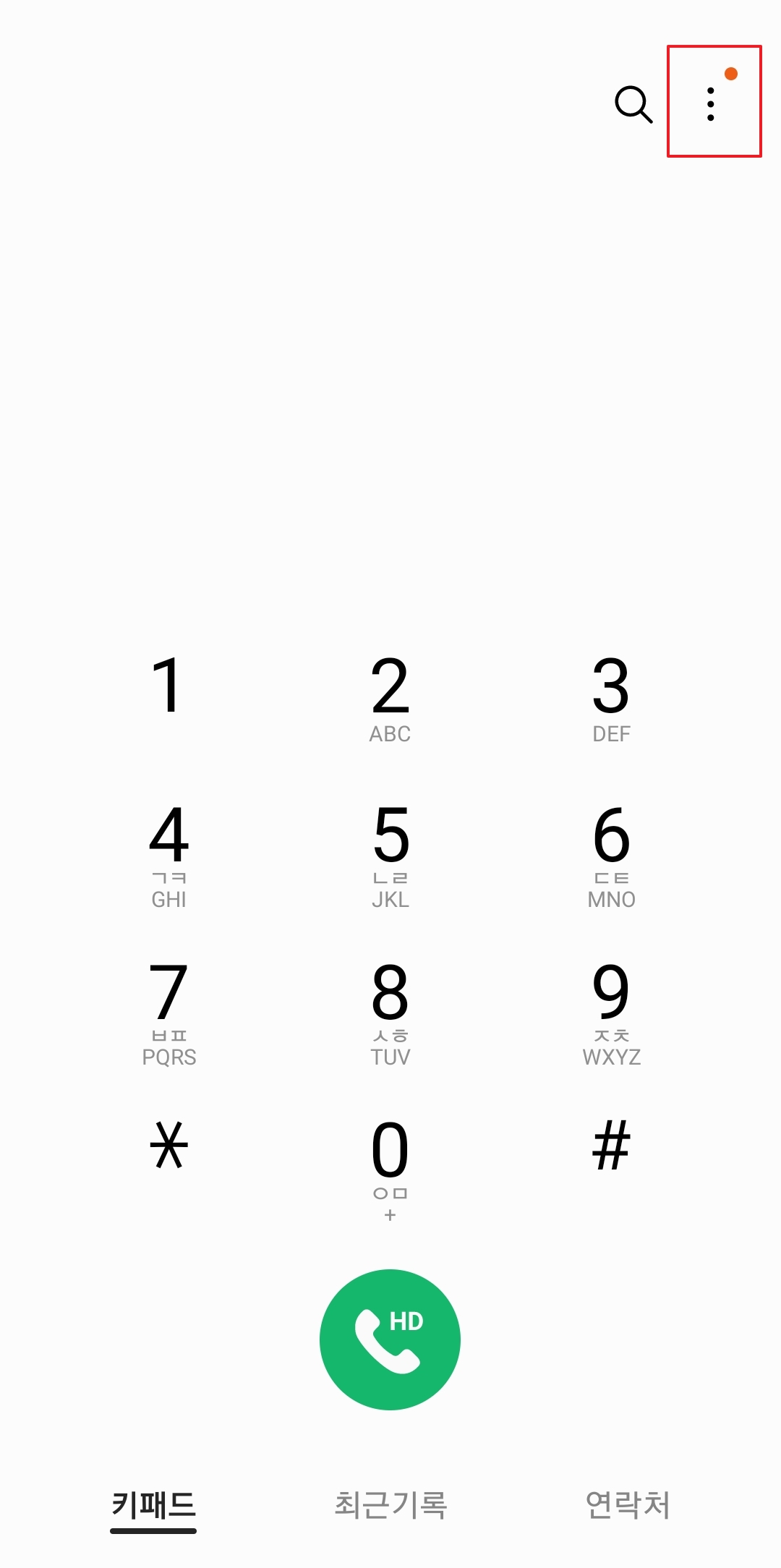 전화 앱 내 키패드 화면 우측 상단에 있는 점 3개 아이콘을 눌러 추가 메뉴를 불러옵니다.