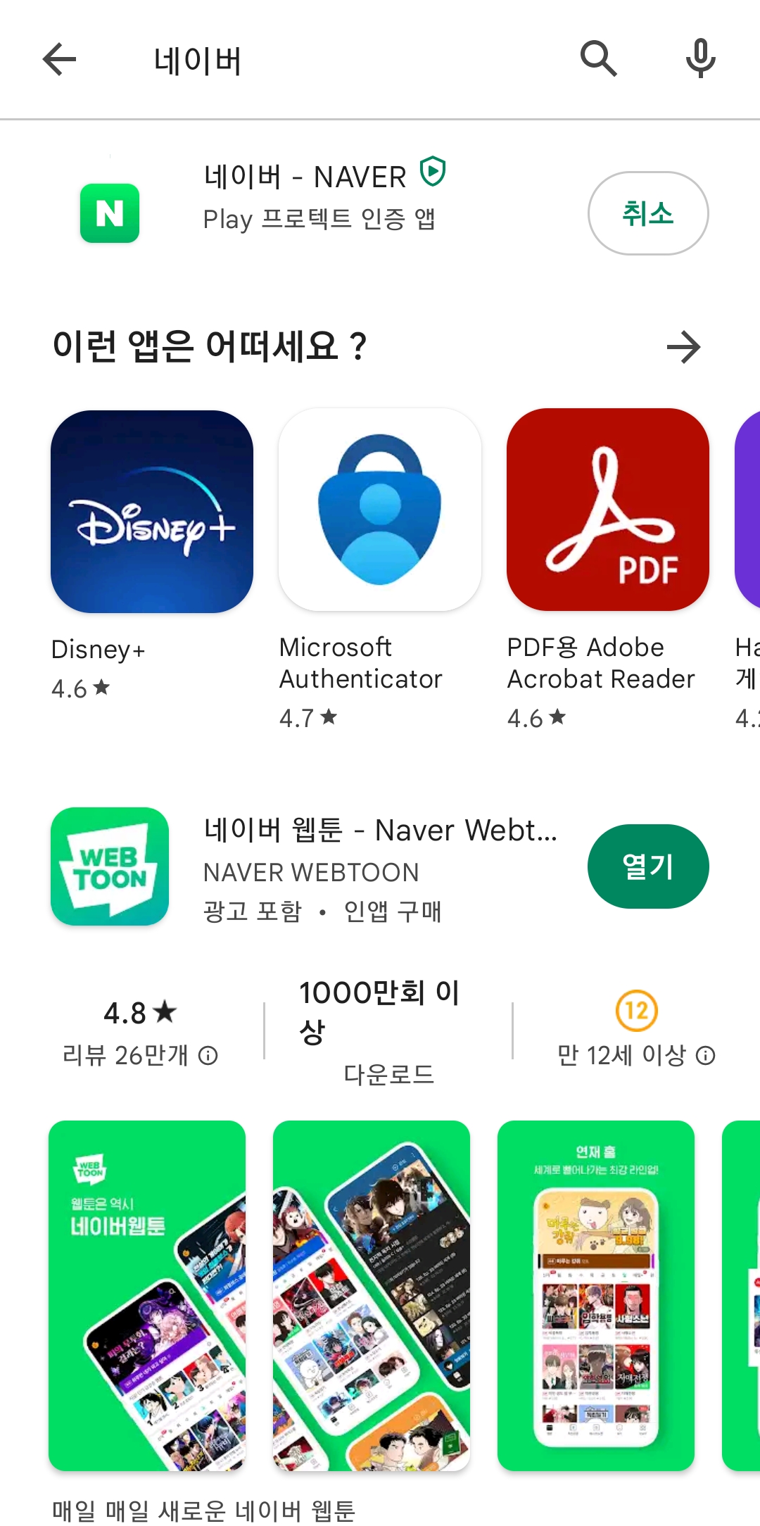 설치가 완료되면 버튼이 ‘설치’ → ‘열기’로 변경됩니다. 이 버튼을 누르면 네이버 앱이 처음 실행되며, 이후 **초기 설정 과정**으로 넘어갑니다.