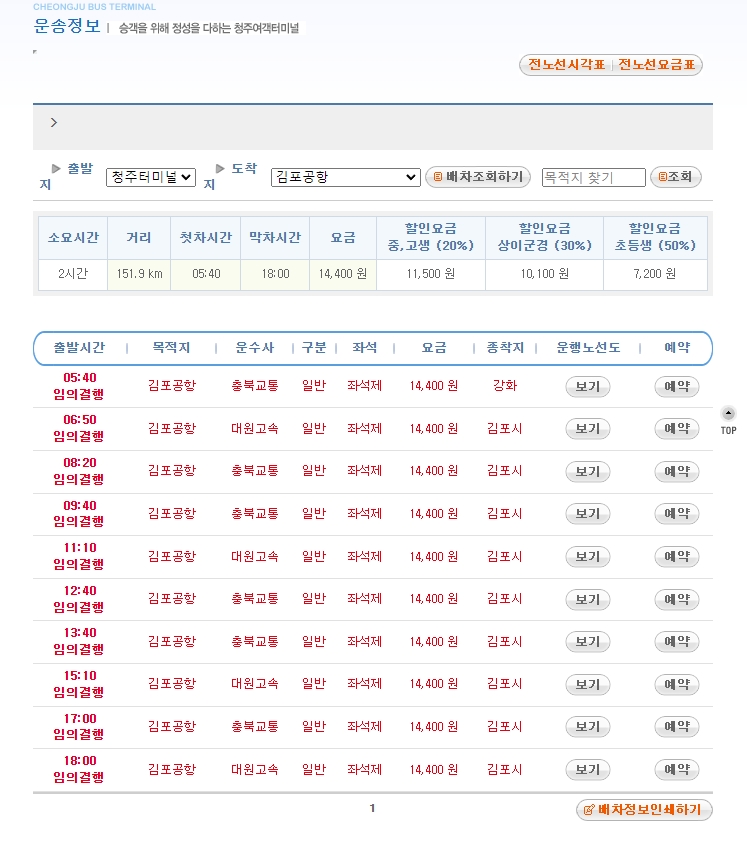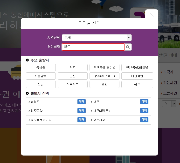 홈페이지 좌측에 있는 운송정보조회 메뉴에서 출발지를 청주터미널로 기본 설정할 수 있으며, 필요 시 청주대정류소, 남청주정류소, 사창정차장, 청주공항정차장으로 변경할 수 있습니다.