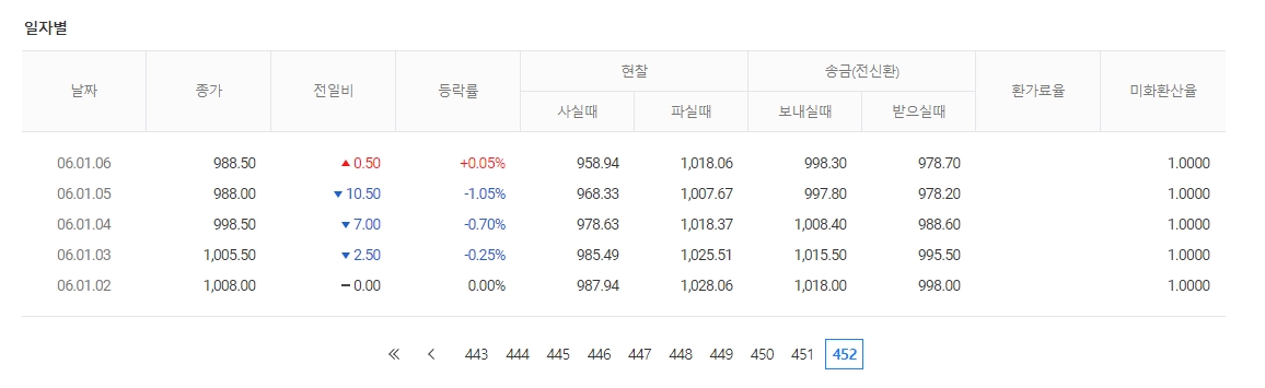 조금 내려가면 일자별 환율 표가 보입니다. 원하는 날짜를 선택하면 그날의 고시가·최저가·전일 대비 변동률이 함께 표시돼 변동 흐름을 한눈에 파악하기 좋습니다.