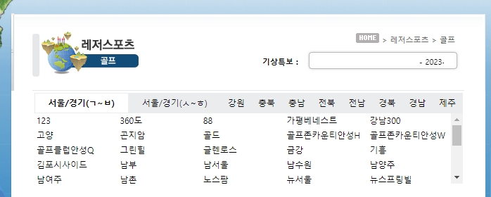 2. 상단 메뉴에서 레저스포츠 항목을 클릭하세요. 이어서 골프 메뉴를 선택하면 전국 골프장별 날씨 예보 목록으로 이동합니다.