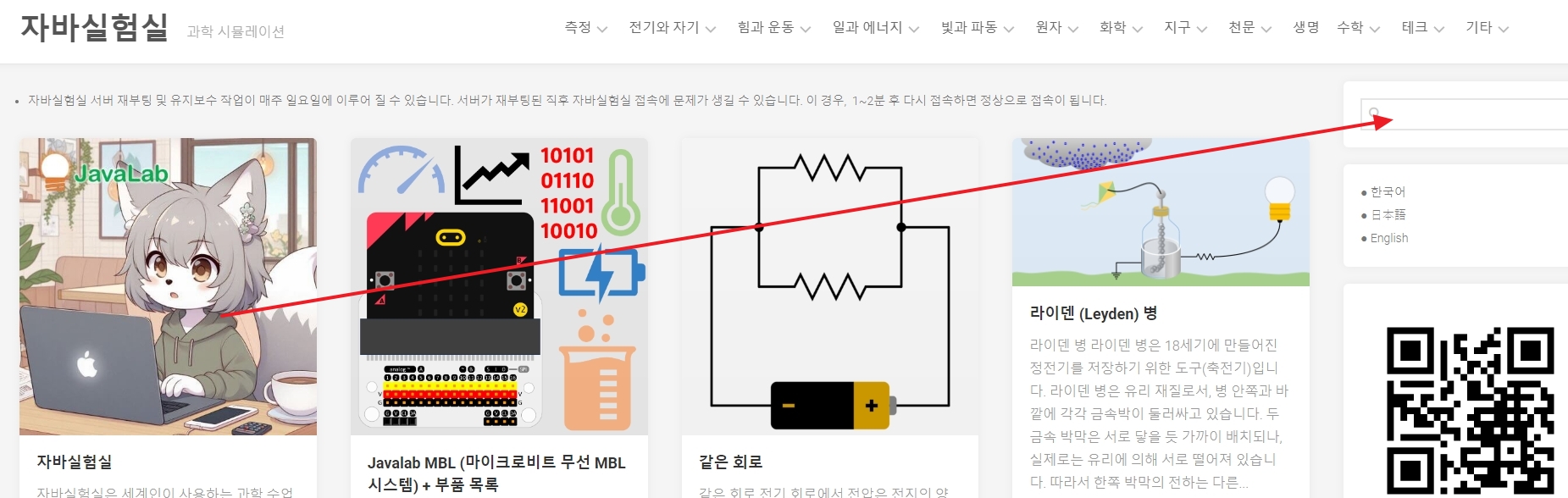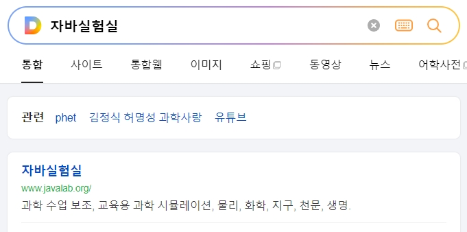 1. 자바실험실 홈페이지에 접속하면 교육용 과학 시뮬레이션을 포함해 물리, 화학, 지구, 천문, 생명 분야의 다양한 보조 자료를 이용할 수 있습니다.