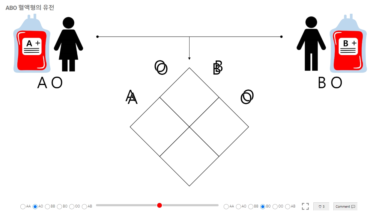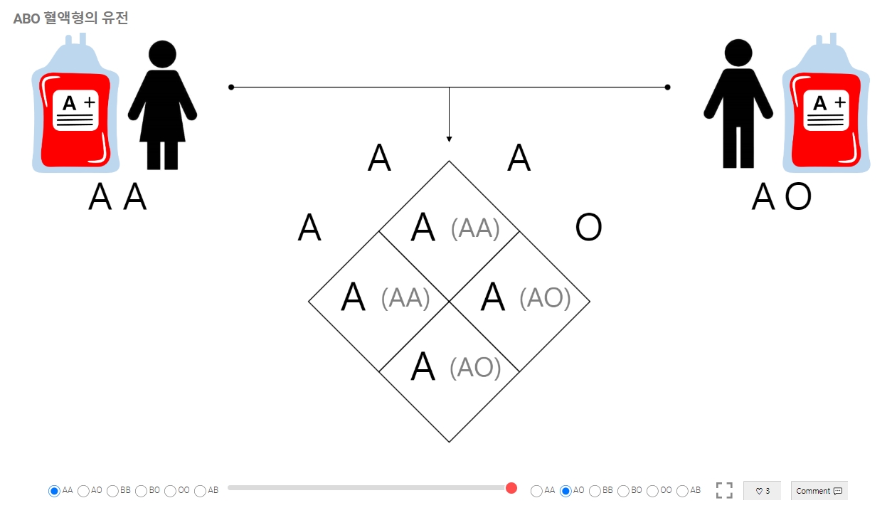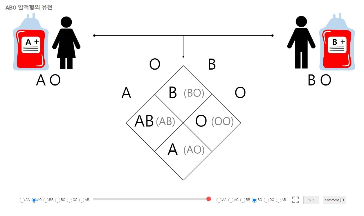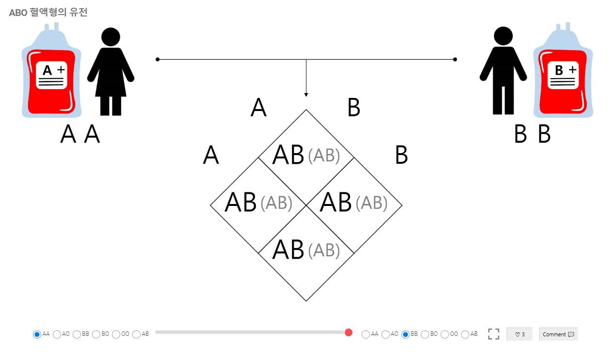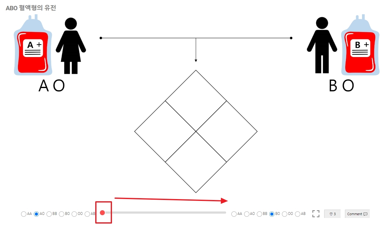 3. 페이지에는 혈액형이 어떻게 유전되는지 보여주는 스크롤바가 있으며, 이를 오른쪽으로 이동해 다양한 결합 결과를 확인할 수 있습니다.